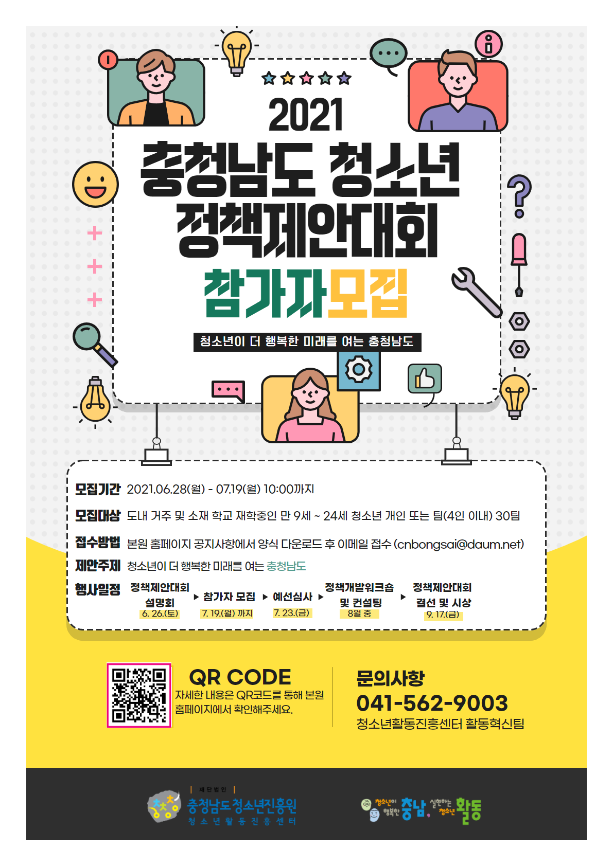 | 제목 | 2021 충청남도 청소년정책제안대회 참가자 모집 안내 | ||||
