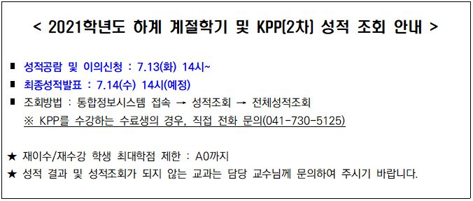 『 2021학년도 하계 계절학기 및 KPP(2차) 성적 조회 안내 』글의 상세내용을 확인하는 표로 제목, 부서명, 등록일, 조회, 첨부, 내용으로 나뉘어 설명합니다.